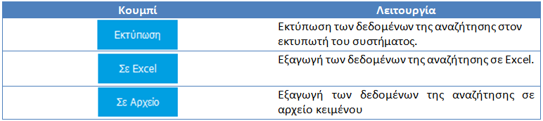 Με το κουμπί αυτό δίνεται η δυνατότητα στο χρήστη είτε να εκτυπώσει την αναζήτηση που έχει εκτελέσει, είτε να την εξάγει σε κάποιο αρχείο.