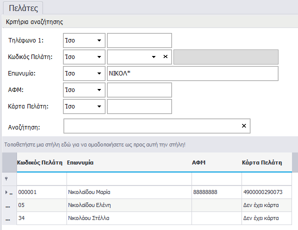 - Μπορείτε να θέσετε το αρχικό μέρος οποιουδήποτε πεδίου τύπου text διαθέσιμου για αναζήτηση και <*>. Για παράδειγμα, στη καρτέλα πελάτες εισάγετε στο πεδίο επωνυμία τους χαρακτήρες ΝΙΚΟΛ* (Ψάχνοντας κάποια Νικολαΐδου).