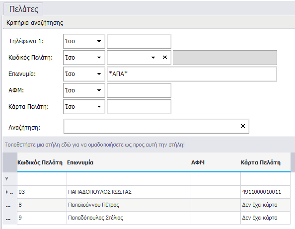 2. Μπορείτε να θέσετε μη εναρκτήριο μέρος οποιουδήποτε πεδίου τύπου text διαθέσιμου για αναζήτηση ανάμεσα από αστερίσκους <*>. Για παράδειγμα, στη καρτέλα πελάτες εισάγετε στο πεδίο επωνυμία τους χαρακτήρες *ΑΠΑ* (Ψάχνοντας κάποιον Παπαδόπουλο ή Παπαϊωάννου).