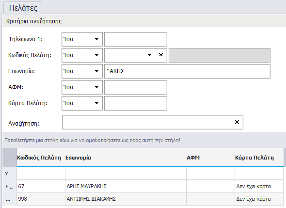 3. Μπορείτε ναθέσετε αστερίσκο <*> και το καταληκτικό μέρος οποιουδήποτε πεδίου τύπου text διαθέσιμου για αναζήτηση. Για παράδειγμα, στη καρτέλα πελάτες εισάγετε στο πεδίο επωνυμία τους χαρακτήρες *ΑΚΗΣ (Ψάχνοντας κάποιον Διακάκη).