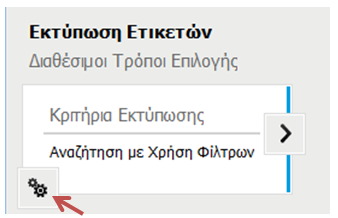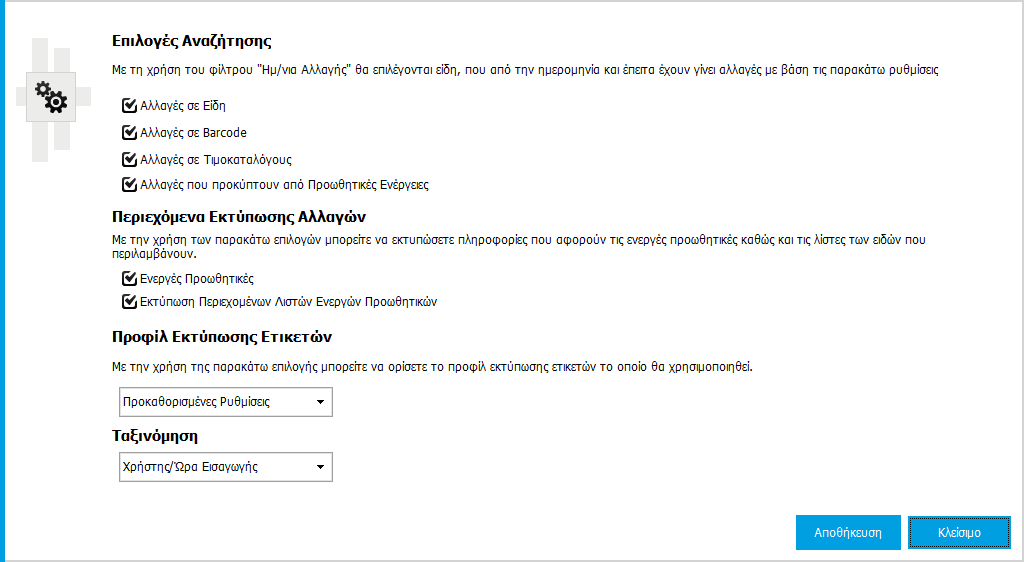 Η δεύτερη λειτουργία είναι η αναζήτηση ειδών αφού έχει συμπληρωθεί το πεδίο «Ημ/νία Αλλαγής». Με την επιλογή αυτή, θα έχετε τη δυνατότητα να προσθέσετε στη λίστα εκτύπωσης, όλα τα είδη τα οποία παρουσιάζουν αλλαγές από την ημερομηνία που έχετε επιλέξει στο πεδίο «Ημ/νία Αλλαγής» με βάση τις ρυθμίσεις που έχετε ορίσει και επιπρόσθετα ικανοποιούν τα κριτήρια αναζήτησης που έχετε επιλέξει. Οι ρυθμίσεις ορίζονται πατώντας , όπως φαίνεται στην εικόνα.