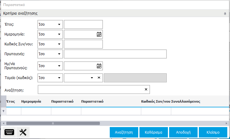 Πατώντας το κουμπί εμφανίζεται μια νέα οθόνη για αναζήτηση παραστατικού.