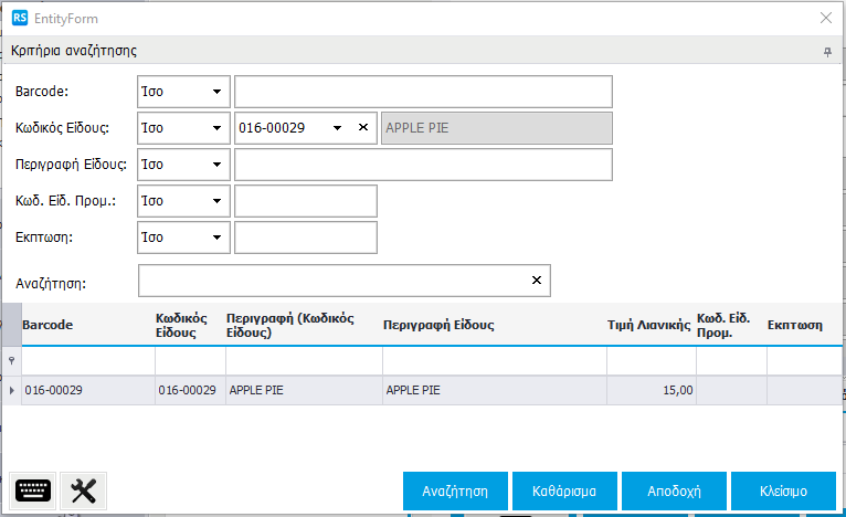 Αφού συμπληρώσετε τα κριτήρια αναζήτησης πατάτε το κουμπί Αναζήτηση και στη συνέχεια το κουμπί Αποδοχή ή Διπλό κλικ στη γραμμή του πίνακα.