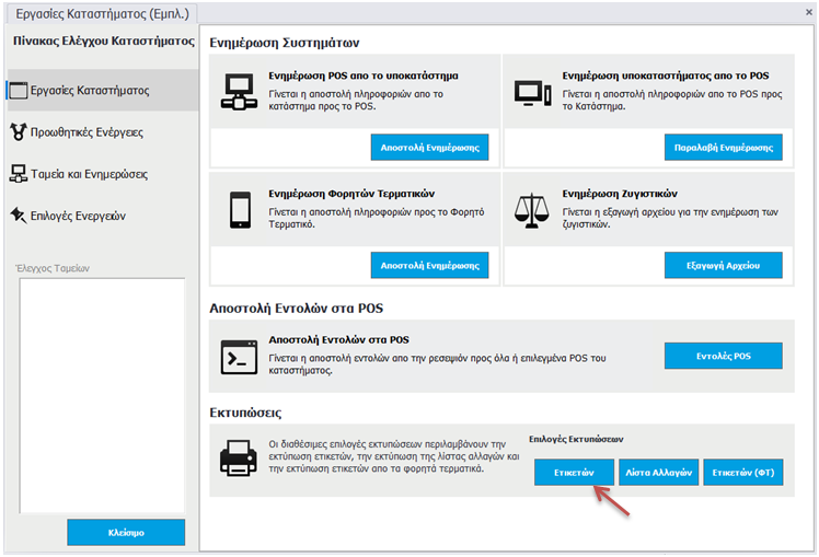 Μπορείτε να μεταβείτε στην οθόνη Εκτύπωση Ετικετών με 2 τρόπους είτε από το μενού Αποθήκη/Εκτυπώσεις/Εκτύπωση Ετικετών είτε από το μενού Ειδικές Εφαρμογές/Καθημερινές Εργασίες/Εργασίες Διαχειριστή. Στην οθόνη Εργασίες Διαχειριστή (Εργασίες Καταστήματος) πατάτε το κουμπί Ετικετών και εμφανίζεται η οθόνη Εκτύπωση Ετικετών.