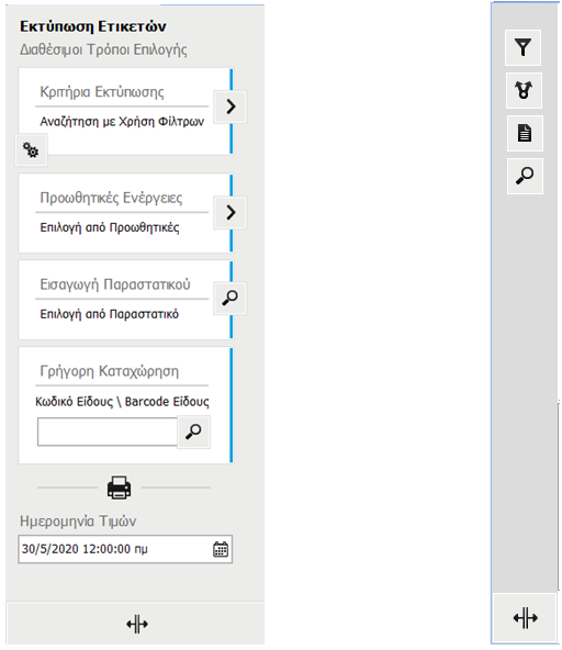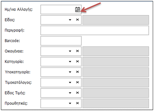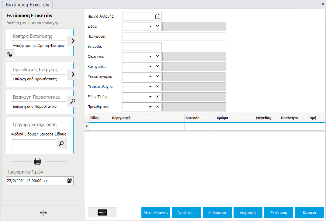 Υπάρχουν 2 λειτουργίες αναζήτησης ειδών με χρήση φίλτρων. Η πρώτη είναι η αναζήτηση ειδών, εφόσον δεν έχει συμπληρωθεί το πεδίο «Ημ/νία Αλλαγής». Με την επιλογή αυτή θα έχετε τη δυνατότητα να προσθέσετε στη λίστα εκτύπωσης όλα τα είδη τα οποία ικανοποιούν τα κριτήρια αναζήτησης που έχετε ορίσει.