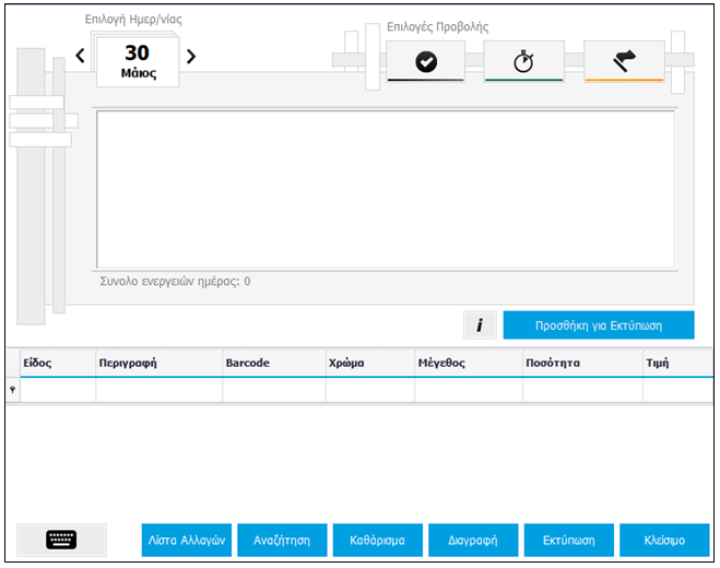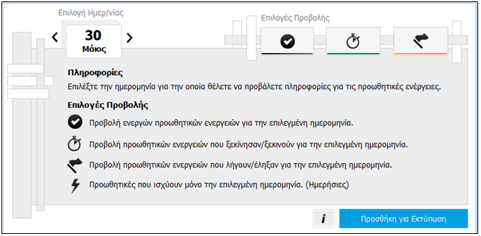 Πάνω αριστερά εμφανίζεται η «Επιλογή Ημερομηνίας» και ως προεπιλεγμένη είναι η τρέχουσα ημερομηνία. Δίπλα εμφανίζονται οι «Επιλογές Προβολής» όπου έχουν οριστεί να είναι προεπιλεγμένες ως ενεργές.