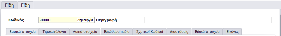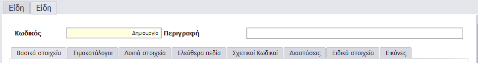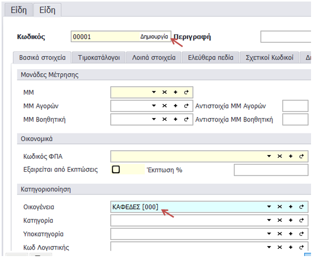 Υπάρχει η δυνατότητα να δοθεί από την εφαρμογή ένας κωδικός στο είδος πατώντας Δημιουργία, που εισάγεται, αφού πρώτα έχετε επιλέξει την Οικογένεια στην οποία ανήκει το νέο είδος που θέλετε να δημιουργήσετε.