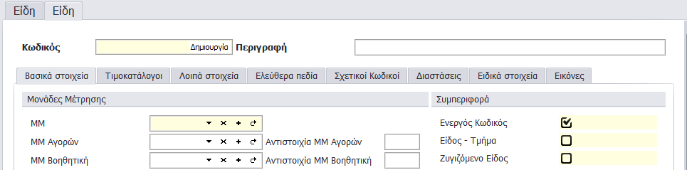 Στη καρτέλα Βασικά Στοιχεία το πεδίο Ενεργός Κωδικός είναι τσεκαρισμένο από προεπιλογή για τα νέα είδη.