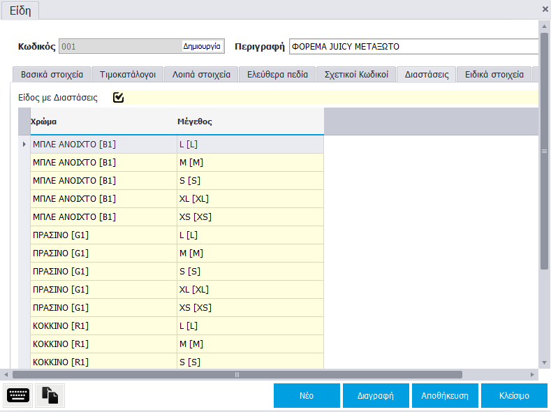 Μια επιπλέον δυνατότητα είναι η δημιουργία ειδών με διαστάσεις. Στη καρτέλα του είδους, στο μενού Διαστάσεις μπορείτε να ορίσετε το χρώμα και το μέγεθος του είδους. Επιπλέον, για θα πρέπει να είναι επιλεγμένο το πεδίο «Είδος με Διαστάσεις».