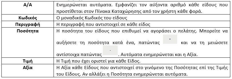 Στο κέντρο της οθόνης υπάρχει ο Πίνακας Καταχώρησης ο οποίος εμφανίζει τα είδη που πρόκειται να αγοράσει ο πελάτης.