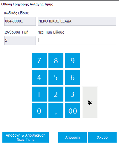 Όταν επιλέξετε προς πώληση ένα προϊόν για το οποίο δεν υπάρχει καταχωρημένη τιμή πώλησης εμφανίζεται η Οθόνη Γρήγορης Αλλαγής Τιμής, όπου στο πεδίο Νέα Τιμή Είδους καταχωρείτε την τιμή με την οποία θέλετε να πουλήσετε το προϊόν αυτή τη στιγμή και πατάτε Αποδοχή. Στη περίπτωση που θέλετε να αποθηκευτεί η τιμή που δώσατε, ως τιμή πώλησης του είδος και για επόμενες συναλλαγές πατάτε το κουμπί Αποδοχή & Αποθήκευση Νέας Τιμής.