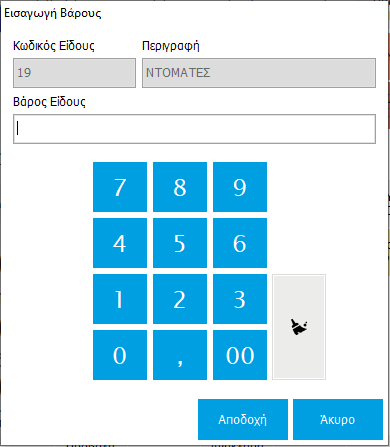 Όταν επιλέξετε προς πώληση ένα προϊόν το οποίο είναι Ζυγιζόμενο εμφανίζεται η οθόνη Εισαγωγής Βάρους, όπου στο πεδίο Βάρος Είδους πρέπει να καταχωρηθεί το βάρος του είδους. Αν το συγκεκριμένο Ζυγιζόμενο είδος δεν έχει καταχωρημένη τιμή πώλησης τότε πριν την οθόνη Εισαγωγής Βάρους θα εμφανιστεί η Οθόνη Γρήγορης Αλλαγής Τιμής.