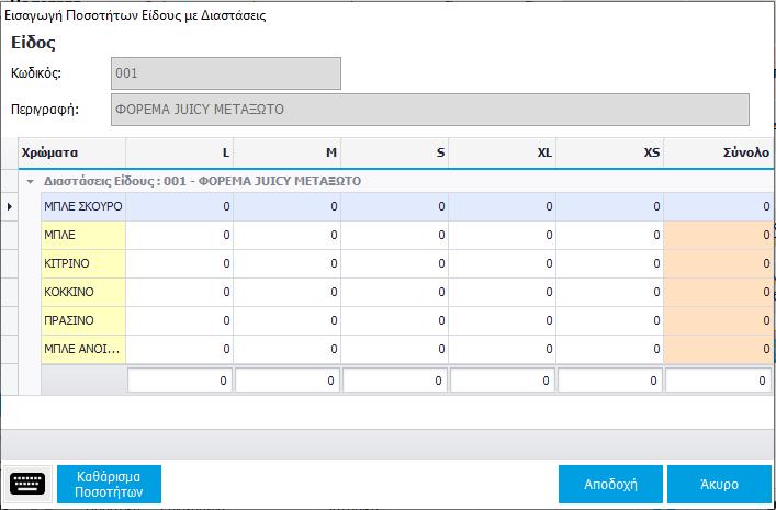 Όταν επιλέξετε προς πώληση ένα προϊόν το οποίο παρακολουθείται σε διαστάσεις  τότε θα εμφανιστεί η οθόνη Εισαγωγή Ποσοτήτων Είδους με Διαστάσεις στην οποία θα πρέπει να καταχωρηθεί η ποσότητα προς πώληση για κάθε μέγεθος και χρώμα.