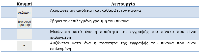 Κουμπιά που βοηθούν στη διαχείριση του Πίνακα Καταχώρησης