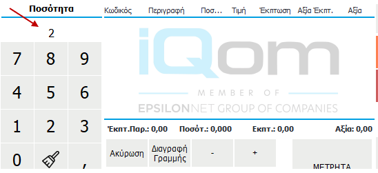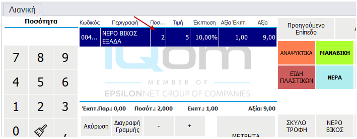 Μπορείτε να καταχωρήσετε τη ποσότητα κάποιου είδους χρησιμοποιώντας το πεδίο Ποσότητα στα αριστερά του Πίνακα Καταχώρησης. Για παράδειγμα, εάν θέλετε ΝΕΡΟ ΒΙΚΟΣ ΕΞΑΔΑ και η ποσότητα να είναι 2, τότε πληκτρολογείτε πρώτα τη ποσότητα 2 στο πεδίο Ποσότητα και στη συνέχεια πατάτε το είδος ΝΕΡΟ ΒΙΚΟΣ ΕΞΑΔΑ.