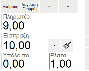 Στο πεδίο Πληρωτέο εμφανίζεται αυτόματα το ποσό που προκύπτει από το άθροισμα των Αξιών του Πίνακα Καταχώρησης, δηλαδή είναι το ποσό που πρέπει να καταβάλει ο πελάτης. Στο πεδίο Ρέστα εμφανίζεται η διαφορά του Μερικού Συνόλου και του Πληρωτέου, δηλαδή το ποσό που πρέπει να δώσει ο χρήστης στον πελάτη. Στο πεδίο Υπόλοιπο εμφανίζεται ένα ποσό εφόσον ο πελάτης επιθυμεί να γίνει η συναλλαγή με περισσότερους τρόπους πληρωμής. Αν το σύνολο μιας συναλλαγής είναι 60 ευρώ και ο πελάτης επιθυμεί να πληρώσει για παράδειγμα με πιστωτική κάρτα τα 40 ευρώ, τότε στο πεδίο Υπόλοιπο θα συμπληρωθεί αυτόματα το ποσό των 20 ευρώ, δηλαδή το ποσό που εκκρεμεί να πληρωθεί, με οποιονδήποτε τρόπο πληρωμής επιλέξει ο πελάτης.