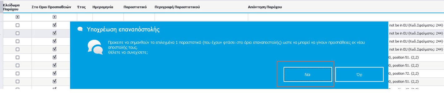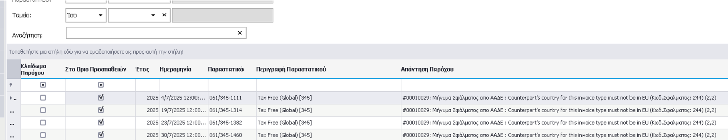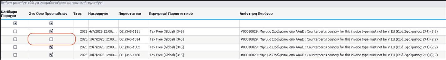 Η στήλη, «Στο Όριο Προσπαθειών» όταν είναι ορισμένη για κάποια παραστατικό, υποδεικνύει ότι το συγκεκριμένο παραστατικό έχει υπερβεί το μέγιστο αριθμό επαναποστολής (SendCount>=3) από την υπηρεσία ετεροχρονισμένης διαβίβασης στον πάροχο (iQomProviderSignature SenderService). Στην περίπτωση αυτή και εφόσον ο χρήστης έχει διορθώσει το παραστατικό σύμφωνα με την απάντηση παρόχου, έχει τη δυνατότητα να προχωρήσει σε επαναποστολή για το συγκεκριμένο παραστατικό.