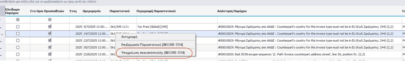 Διαχείριση σφαλμάτων αποστολής παραστατικών στον Πάροχο
