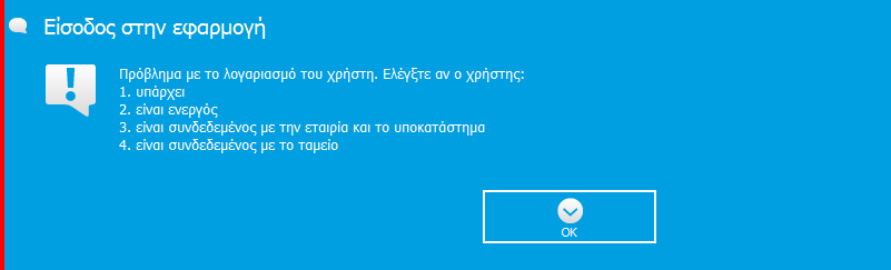 Αν ο χρήστης καταχωρήσει  λάθος όνομα χρήστη ή λάθος κωδικό εμφανίζεται το παρακάτω μήνυμα. Σε αυτή τη περίπτωση ακολουθείτε τις οδηγίες του μηνύματος.