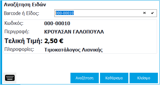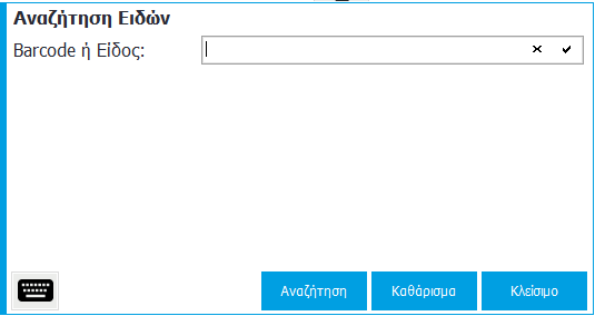 Επιπλέον, για καθάρισμα του πεδίου εισαγωγής πατάτε ‘Καθάρισμα’  και για κλείσιμο της οθόνης αναζήτησης είδους πατάτε ‘Κλείσιμο’.