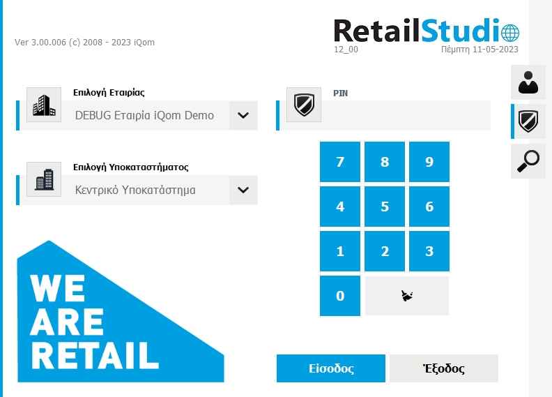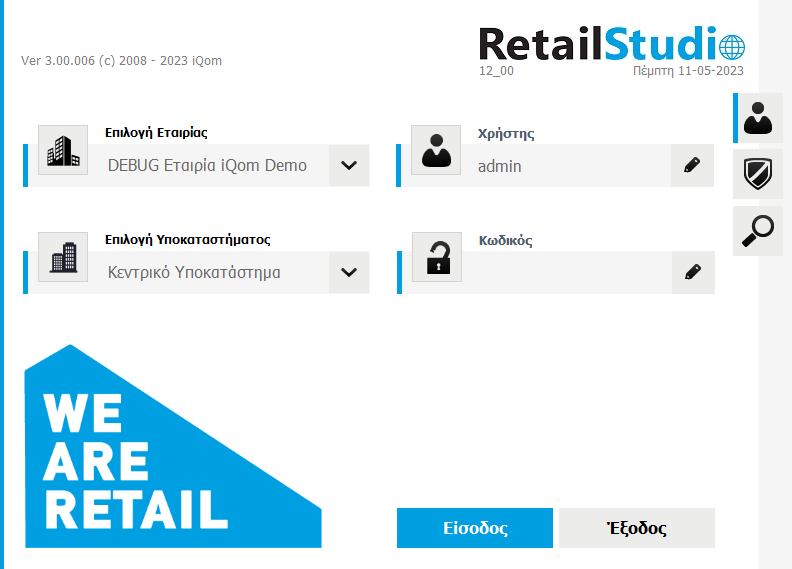 Αφού έχετε εγκαταστήσει την εφαρμογή, πατώντας πάνω στη συντόμευση “Retail Studio”, θα εμφανιστεί η αρχική οθόνη εισαγωγής του συστήματος.