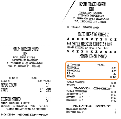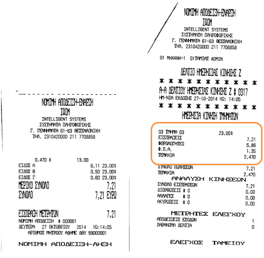 Δεν υπάρχει συμφωνία στις αξίες ΦΠΑ μεταξύ του Ζ του εκτυπωτή και της εφαρμογής. Παρατηρήθηκε ότι οι αξίες ΦΠΑ που αποθηκεύονται από την εφαρμογή σε σχέση με τις αξίες που καταγράφονται στο Ζ διαφέρουν. Το πρόβλημα προκύπτει γιατί η εφαρμογή υπολογίζει την αξία του Φ.Π.Α ανά γραμμή παραστατικού ενώ ο εκτυπωτής υπολογίζει την αξία του Φ.Π.Α. στις συνολικές αξίες ανά κατηγορία Φ.Π.Α. Ακολουθούν παραδείγματα που αναδεικνύουν το πρόβλημα.