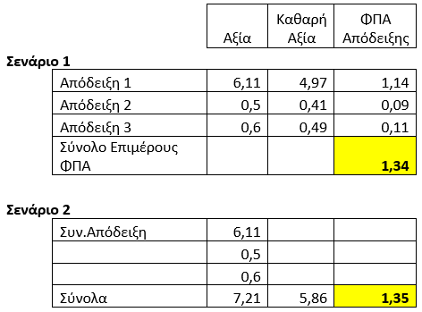 Θα εξετάσουμε δύο σενάρια όπου και στα δύο θα συμμετέχουν τα ίδια είδη με τις ίδιες ποσότητες και τιμή μονάδος με την ίδια τελική αξία αλλά με διαφορά στο ΦΠΑ.