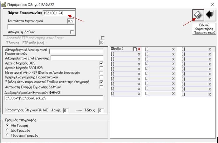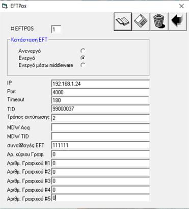 Αφού γίνουν οι ρυθμίσεις την πρώτη φορά και αποθηκευτούν, τότε κάθε φορά που  συμπληρώνετε στο πεδίο #EFTPOS το νούμερο 1 και πατάτε  (Ανάγνωση από ΦΗΜΑΣ), τότε εμφανίζονται οι ρυθμίσεις του πρώτου EFT POS.