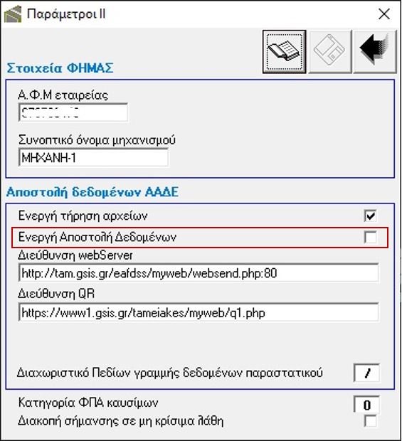 Στο πλαίσιο «Αποστολή δεδομένων ΑΑΔΕ» πρέπει να είναι τσεκαρισμένο το πεδίο «Ενεργή Αποστολή Δεδομένων».