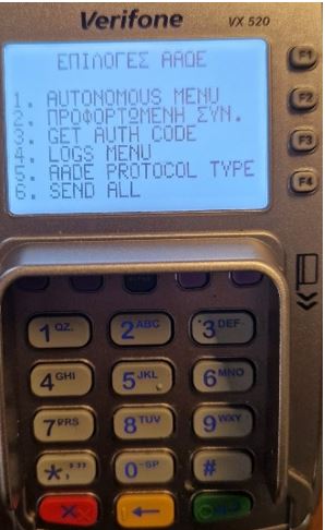 – F4 \ Συνέχεια \ Συνέχεια \ F1 Μενού ΑΑΔΕ \ Κωδικός Επιχείρησης -> 2 (πατάτε πράσινο) \ΑΑΔΕ protocol Type \(με τα βελάκια κάτω επιλέγετε) Get Auth Code\
