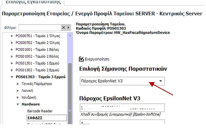 • Στις επιλογές εγκατάστασης στην παράμετρο ΕΑΦΔΣΣ επιλέγετε τον driver Πάροχος EpsilonNet V3 (EpsilonDigitalAPISignProviderV3) (Ο Πάροχος Ηλεκτρονικής Τιμολόγησης διαβιβάζει αυτόματα παραστατικά που εκδίδονται από ERP συστήματα στην πλατφόρμα myDATA)