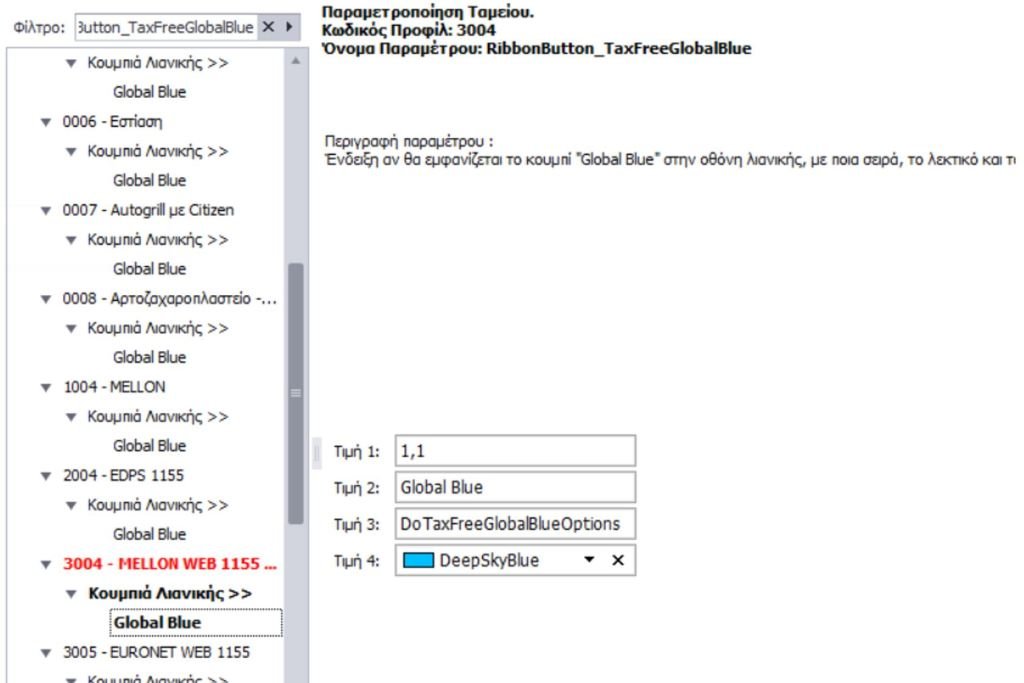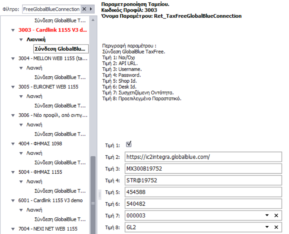 Η ενεργοποίηση του GlobalBlue TaxFree γίνεται από τις Επιλογές Εγκατάστασης από την παράμετρο Σύνδεση GlobalBlue TaxFree (Ret_TaxFreeGlobalBlueConnection), με τις εξής τιμές: