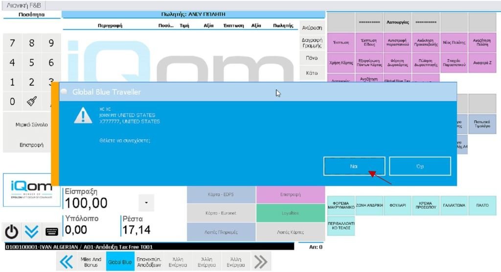 Με το κουμπί Global Blue Tax Free και την επιλογή Global Blue Traveller γίνεται το άνοιγμα πελάτη.