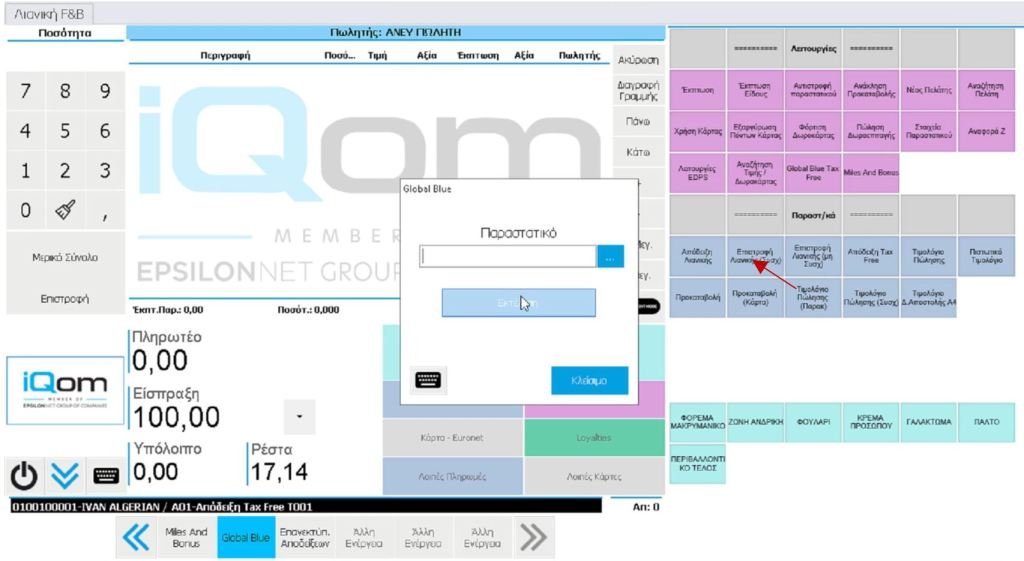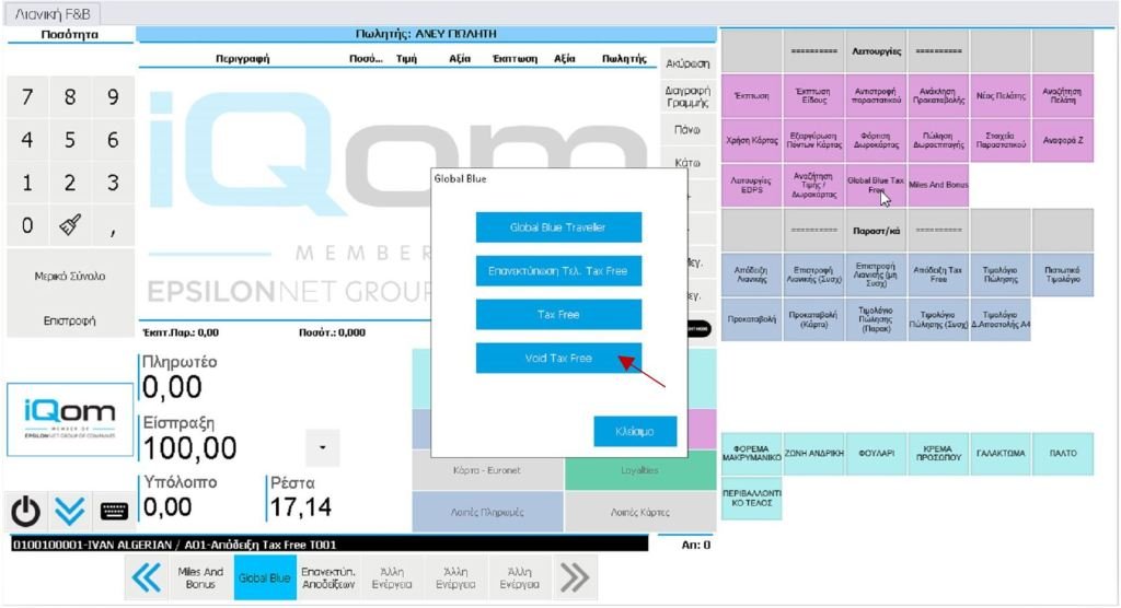 Με το κουμπί Global Blue Tax Free και την επιλογή Void Tax Free γίνεται η ακύρωση του παραστατικού.