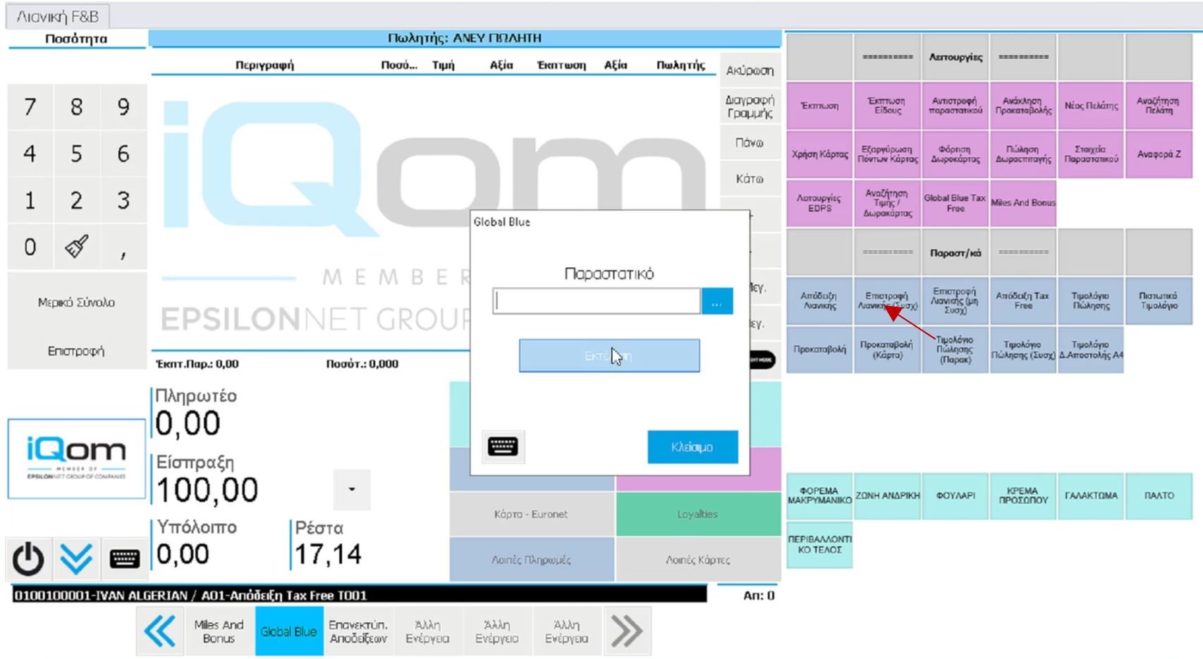 Με το κουμπί Global Blue Tax Free και την επιλογή Επανεκτύπωση Τελ. Tax Free γίνεται η επανεκτύπωση του τελευταίου παραστατικού της GlobalBlue.