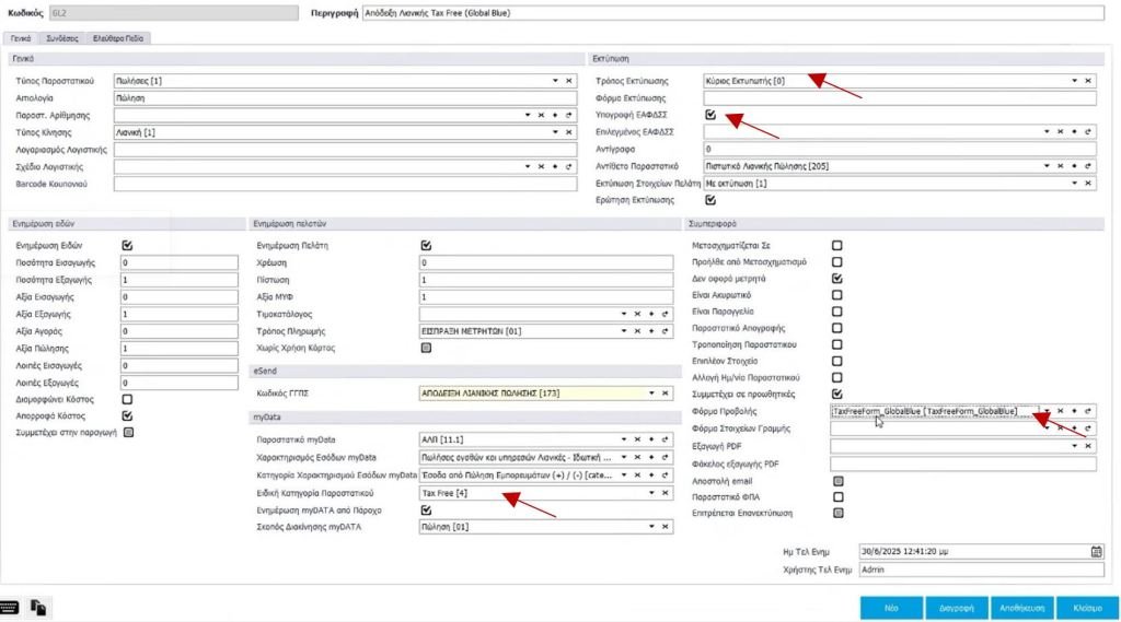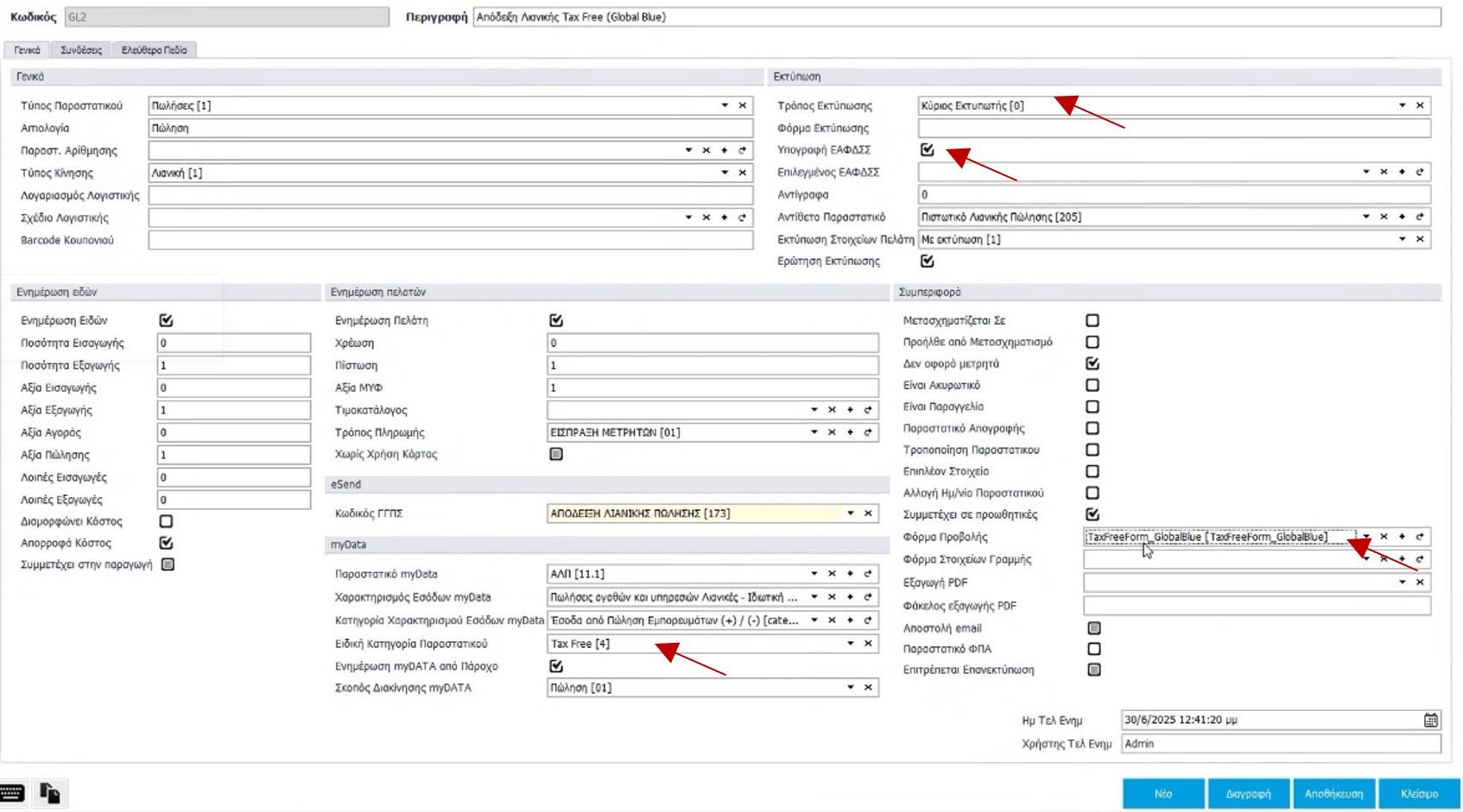 Για το GlobalBlue TaxFree χρειάζεται να δημιουργήσετε παραστατικό με συμπληρωμένα τα εξής χαρακτηριστικά: