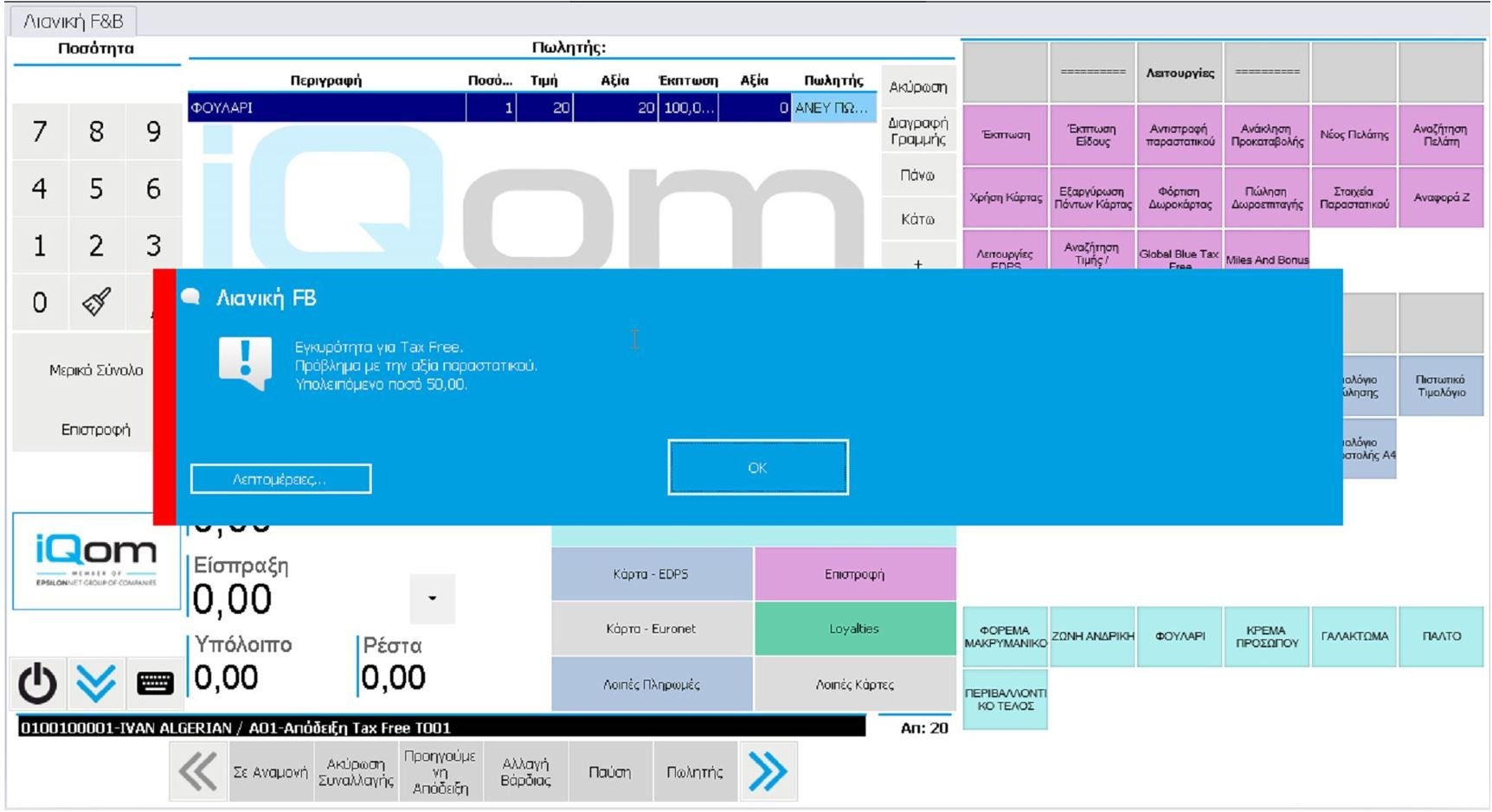 - Σε περίπτωση που πάει να εκδοθεί παραστατικό με αξία χαμηλότερη από αυτή που έχει ορίσει η global εμφανίζεται το παρακάτω μήνυμα.