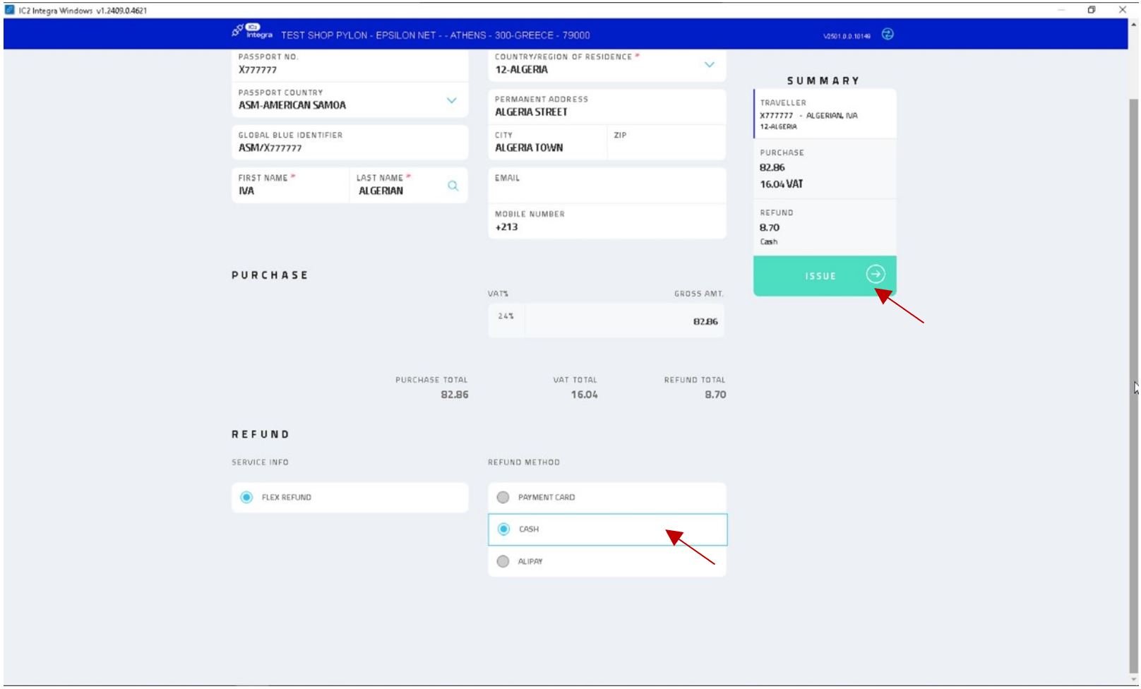 Στη συνέχεια ανοίγει το εργαλείο Integra. Εάν επιθυμείτε μπορείτε να συμπληρώσετε τα πεδία ZIP και EMAIL, ώστε να εμφανιστούν στη φόρμα εκτύπωσης. Στο σημείο REFUND METHOD χρειάζεται να συμπληρωθεί ο τρόπος πληρωμής και τέλος πατάτε το κουμπί ISSUE για την έκδοση της φόρμας Global Tax Free.