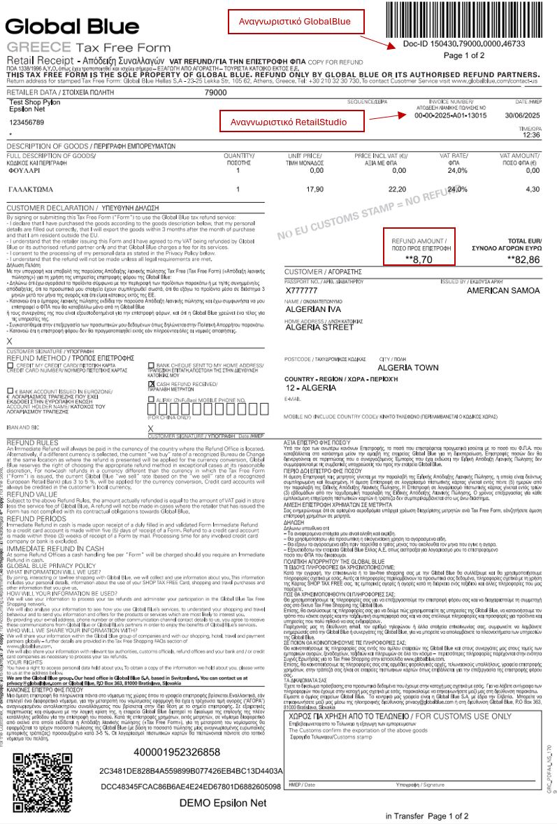 Σημείωση: Αφορά την επανεκτύπωση της φόρμας της Global Blue και όχι το παραστατικό του RetailStudio.