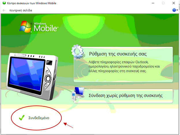 Για να γίνει επιβεβαίωση ότι τα Windows αναγνωρίζουν το φορητό τερματικό, ανοίγετε το Κέντρο συσκευών των Windows Mobile από την έναρξη των Windows και βλέπετε εάν έχει γίνει σύνδεση με το φορητό τερματικό.
