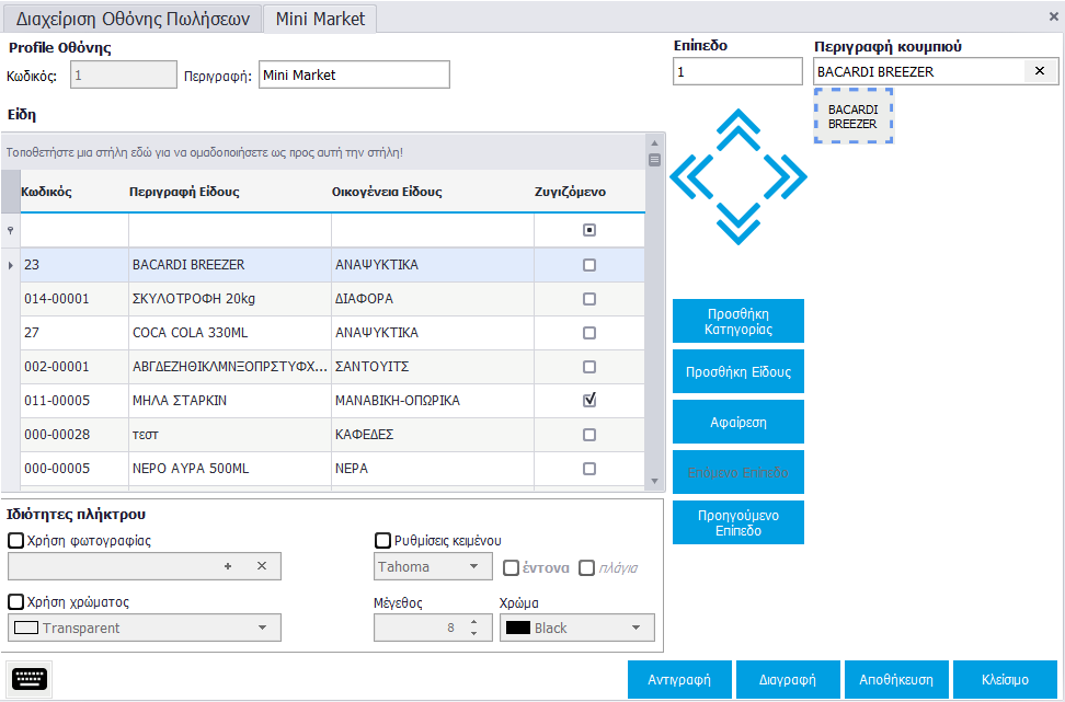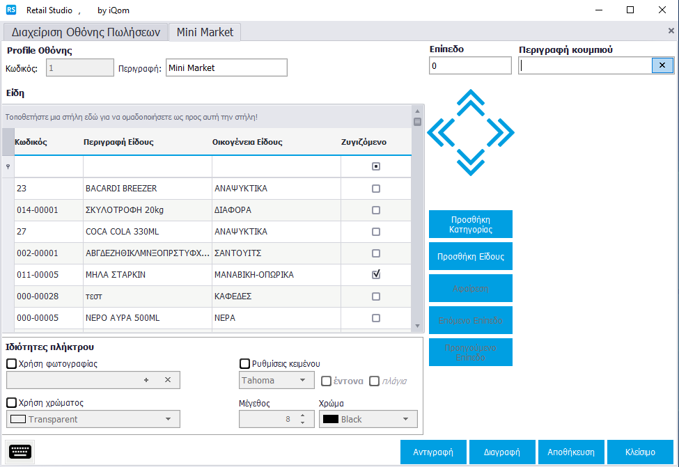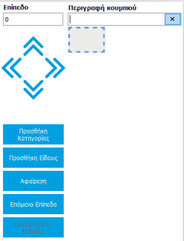 Στη δεξιά πλευρά του παραθύρου φαίνεται ο πίνακας όπου θα δημιουργήσετε τα κουμπιά με τα Είδη ή με τις Κατηγορίες Ειδών σύμφωνα με τις ανάγκες του καταστήματος, καθώς και τα κουμπάκια που σας βοηθούν στην επεξεργασία του.