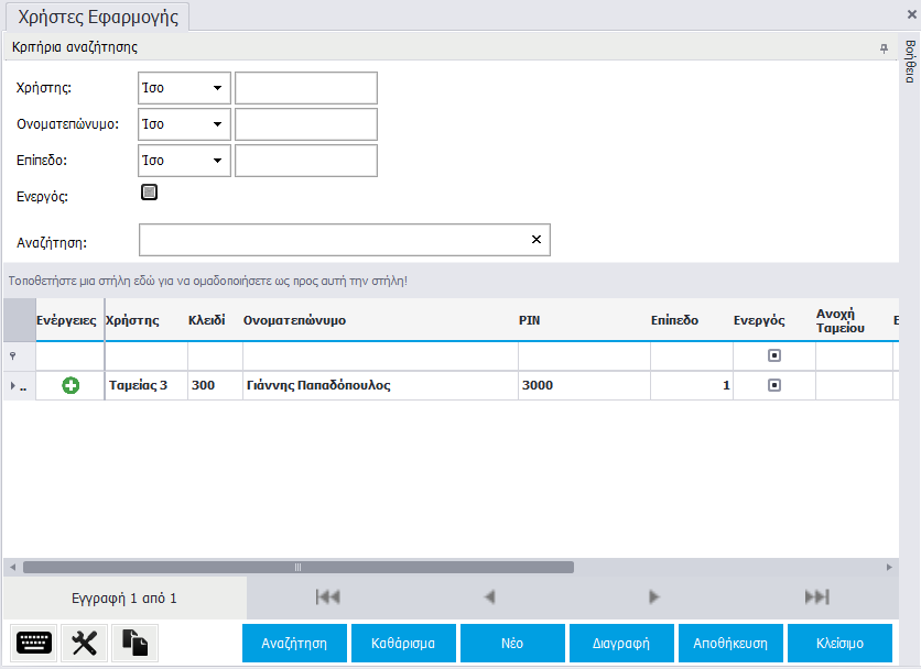 • Επίπεδο: Οι δυνατότητες που θα έχει κάθε χρήστης. Υπάρχουν 3 επίπεδα. Στο Επίπεδο 0 ορίζεται ο Administrator και έχει τον πλήρη έλεγχο της εφαρμογής. Στο Επίπεδο 1 ορίζεται ο Advanced User (π.χ. Υπεύθυνος Καταστήματος) και στο Επίπεδο 2 ορίζεται ο User (π.χ. Ταμίας), όπου έχουν μειωμένες δυνατότητες.