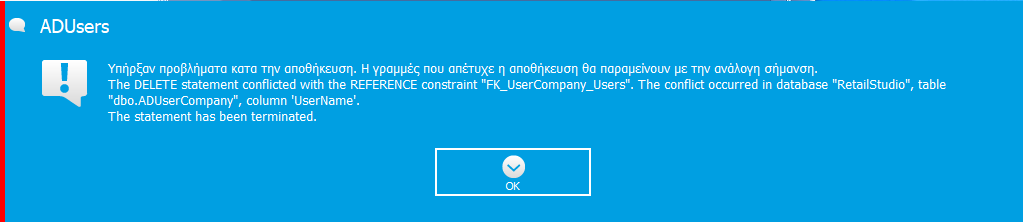 Αν κάποια στιγμή χρειαστεί να σβήσετε κάποιον χρήστη πρέπει να τον διαγράψετε πρώτα από την καρτέλα Σύνδεση Χρηστών Εταιρειών και μετά από την καρτέλα Χρήστες εφαρμογής. Διαφορετικά θα εμφανιστεί μήνυμα λάθους.