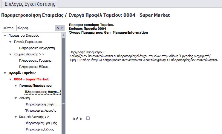 Σε περίπτωση που δεν επιθυμείτε να ανανεώνονται οι πληροφορίες στον Έλεγχο Ταμείων, στις επιλογές εγκατάστασης στην παράμετρο «Πληροφορίες Διαχειριστή» χρειάζεται να μην είναι επιλεγμένη η τιμή 1.