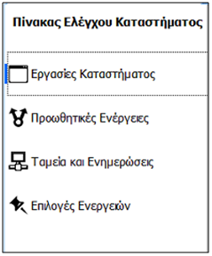 Από το μενού Ειδικές Εφαρμογές/Καθημερινές Εργασίες/Εργασίες Διαχειριστή μπορείτε να μεταβείτε στη καρτέλα «Εργασίες Καταστήματος». Ο Πίνακας Ελέγχου του καταστήματος έχει τις εξής 4 κατηγορίες: Εργασίες Καταστήματος, Προωθητικές Ενέργειες, Ταμεία και Ενημερώσεις, Επιλογές Ενεργειών.