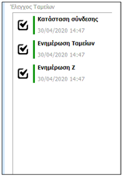Στον Πίνακα Ελέγχου γίνεται και Έλεγχος Ταμείων, όπου φαίνεται αν όλα λειτουργούν σωστά. Ο έλεγχος τρέχει κάθε x χρόνο στα σημεία που ενημερώνει ο server με την προϋπόθεση ότι η οθόνη «Εργασίες Καταστήματος» έχει ανοίξει τουλάχιστον μία φορά.