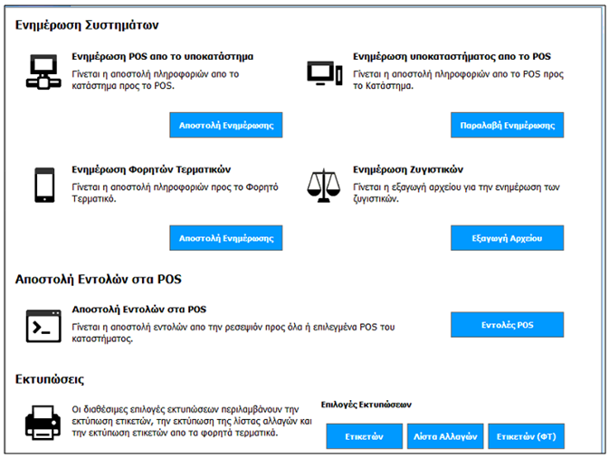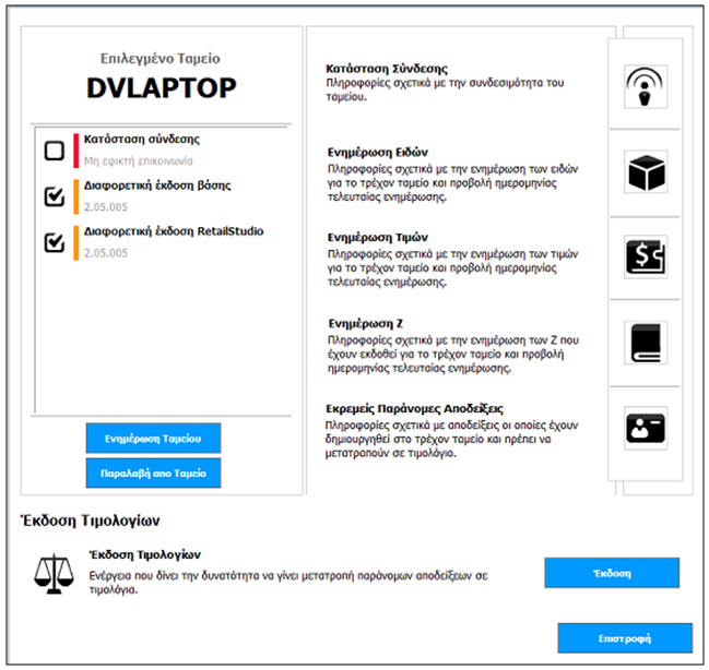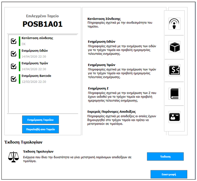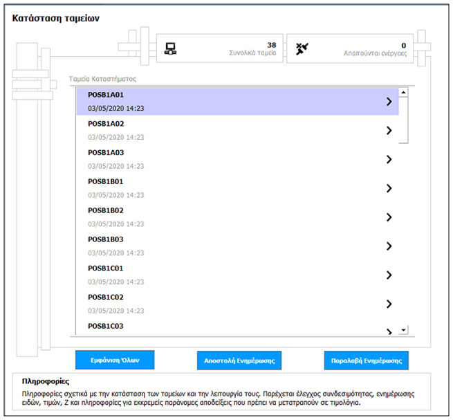 Μπορείτε να δείτε την κατάσταση των ταμείων και τη λειτουργία τους. Είναι δυνατή η ενημέρωση των ταμείων, όπως και η παραλαβή ενημέρωσης από τα ταμεία πατώντας τα αντίστοιχα κουμπιά.