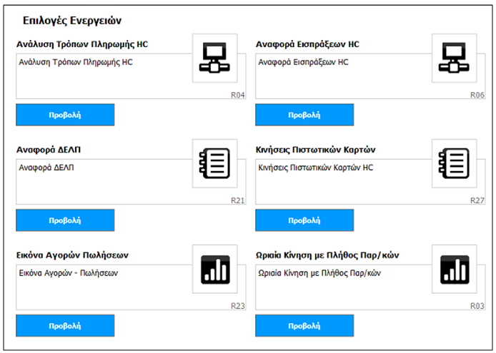 Μπορείτε να ορίσετε συντομεύσεις για τα μενού που χρησιμοποιείτε συχνά. Πατώντας το κουμπί Προβολή ανοίγει το αντίστοιχο μενού σε νέα καρτέλα. Κάτω δεξιά σε κάθε μενού φαίνεται ο κωδικός του.