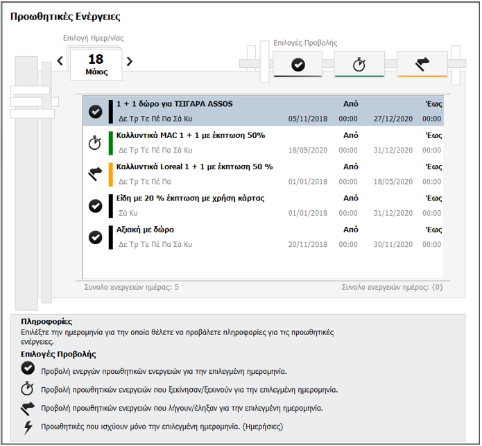 Μπορείτε να επιλέξετε οποιαδήποτε ημερομηνία επιθυμείτε για να δείτε τις προωθητικές που ισχύουν την επιλεγμένη ημερομηνία. Για να επιλέξετε ξανά την σημερινή ημερομηνία κάνετε κλικ πάνω στο κουτάκι.