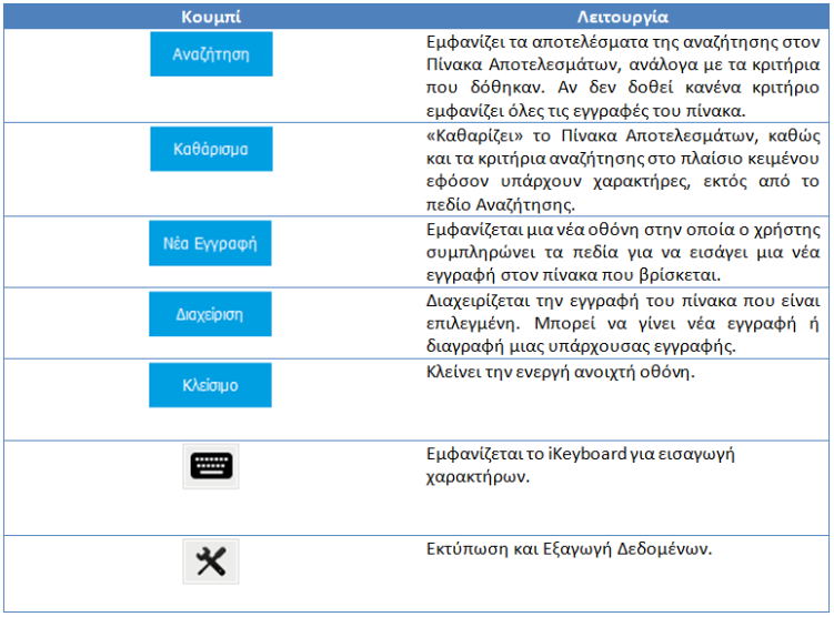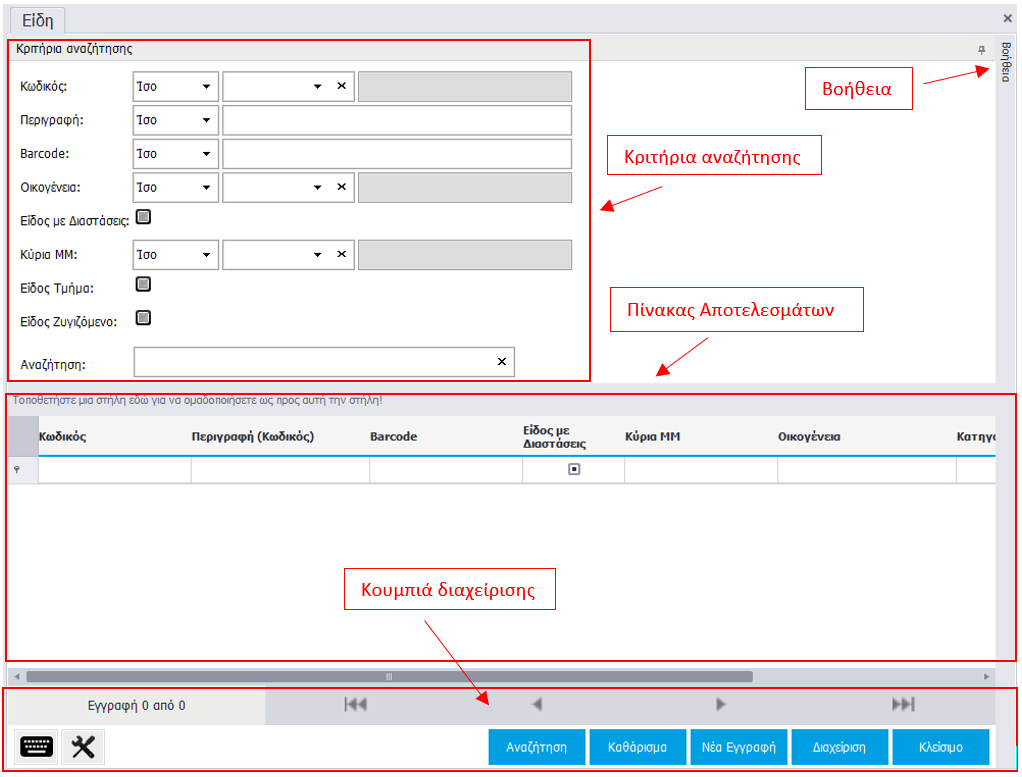 Η οντότητα χωρίζεται σε τέσσερα μέρη, στα κριτήρια αναζήτησης, στον πίνακα αποτελεσμάτων, στα κουμπιά διαχείρισης και στο μενού βοήθεια.